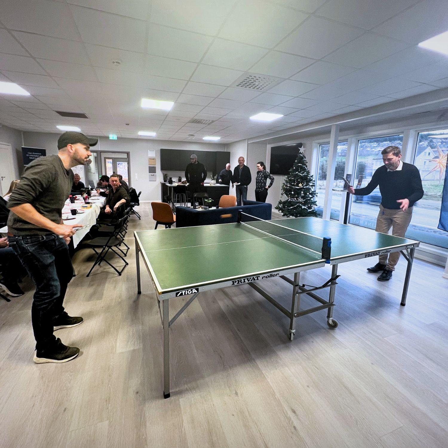 Tiltakene inkluderer også fokus på arbeidsmiljøet, noe som bidrar til økt trivsel for våre ansatte. Et eksempel på dette er anskaffelsen av bordtennisbord i lokalene, som har blitt populært blant de ansatte – og da måtte vi selvfølgelig utfordre ordføreren til en uformell bordtenniskamp. -