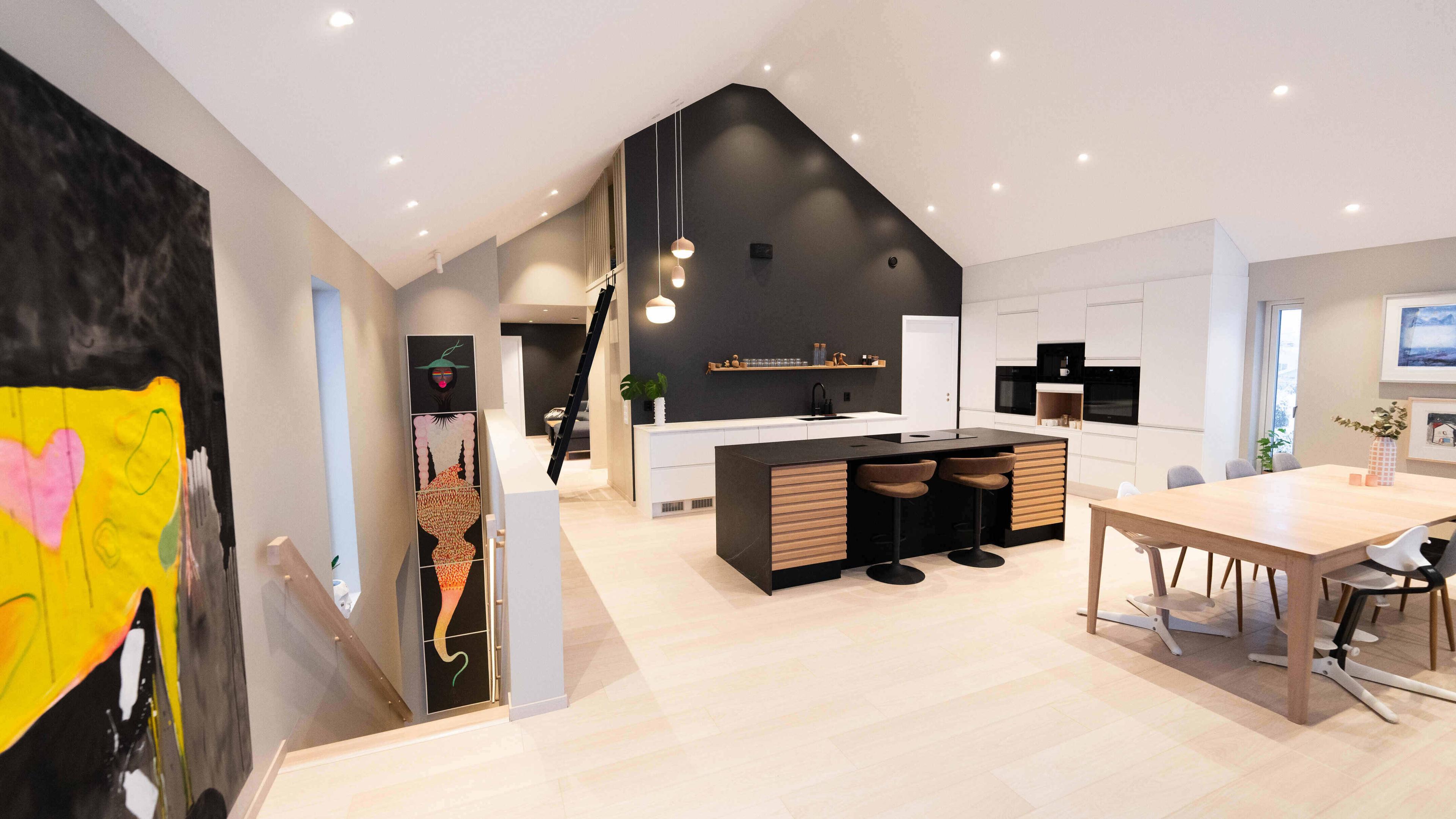 Interiør i lyst tre, sammen med kontraster i matt sort, takspotter og trappegelender i glass, gir et flott og moderne inntrykk når du kommer inn i boligen.