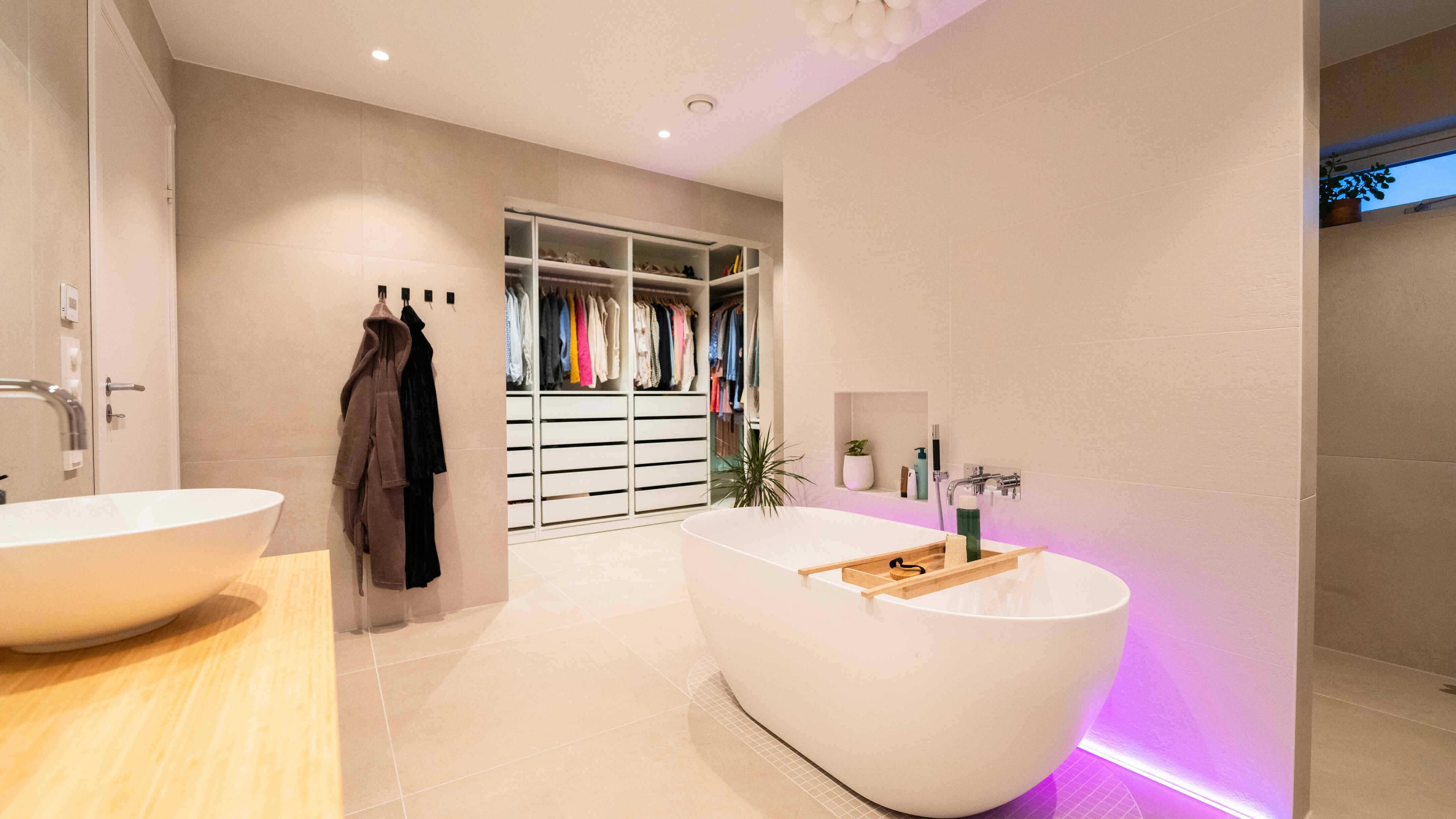 Kunden fikk utnyttet plassen på badet godt. Her har også kunden direkte adkomst til walk in-garderobe.