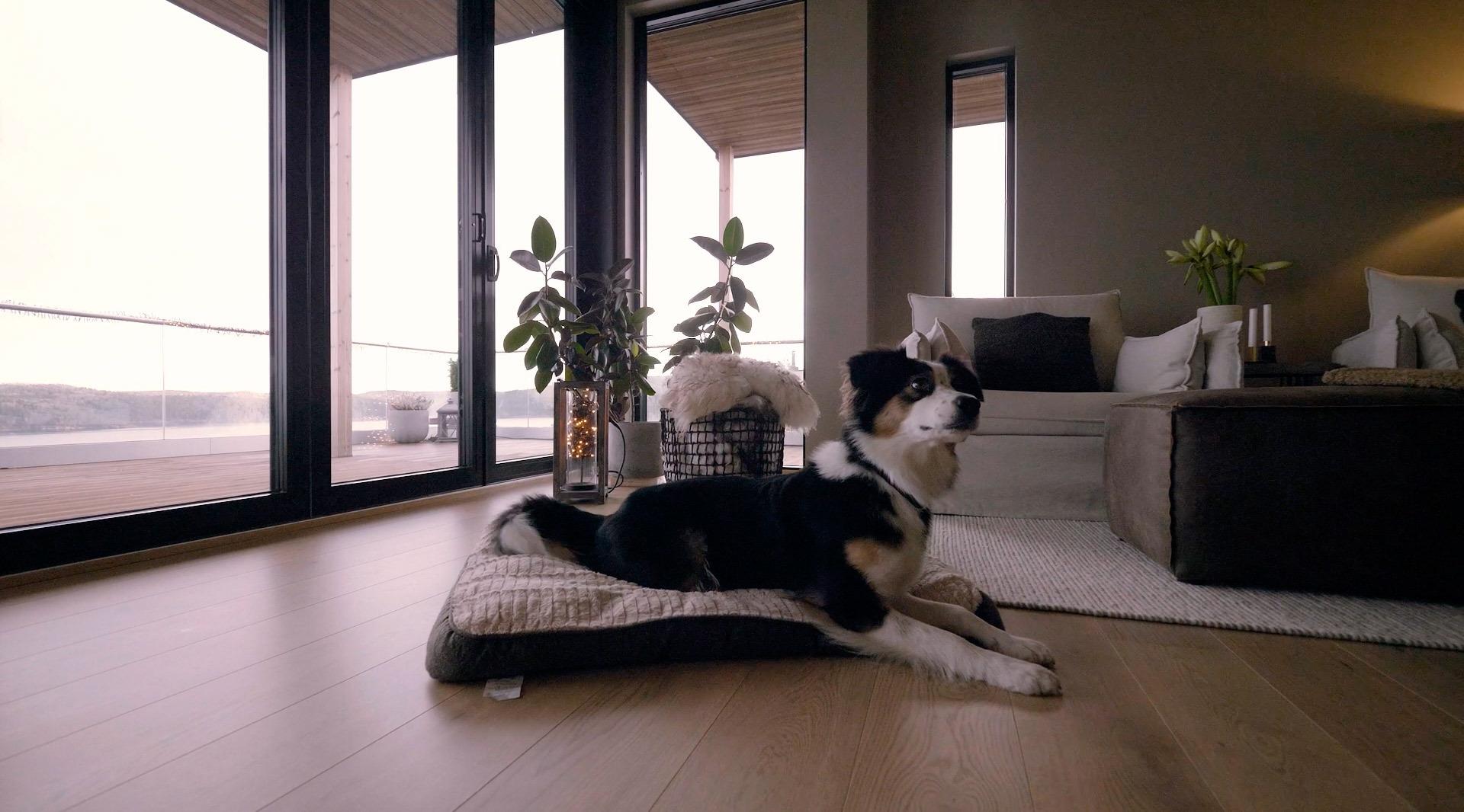 I dag lever Lasse og Elisabeth lykkelig i funkishuset sitt sammen med sine to gutter og en hund. Boligen har fire soverom, og paret fikk det som de ønsket med kjøkken, stue, soverom, walk in-garderobe og bad i andre etasje. Huset er vakkert innredet med varme, nedtonede farger og flotte elementer av lysoljet tre. På kjøkkenet står en mørk og stilren innredning fra Sigdal Kjøkken i vakker kontrast til de matte, beige veggene. Kaffemaskinen er integrert i kjøkkeninnredningen, og vitner om parets valg om at ingen ting skulle overlates til tilfeldighetene.