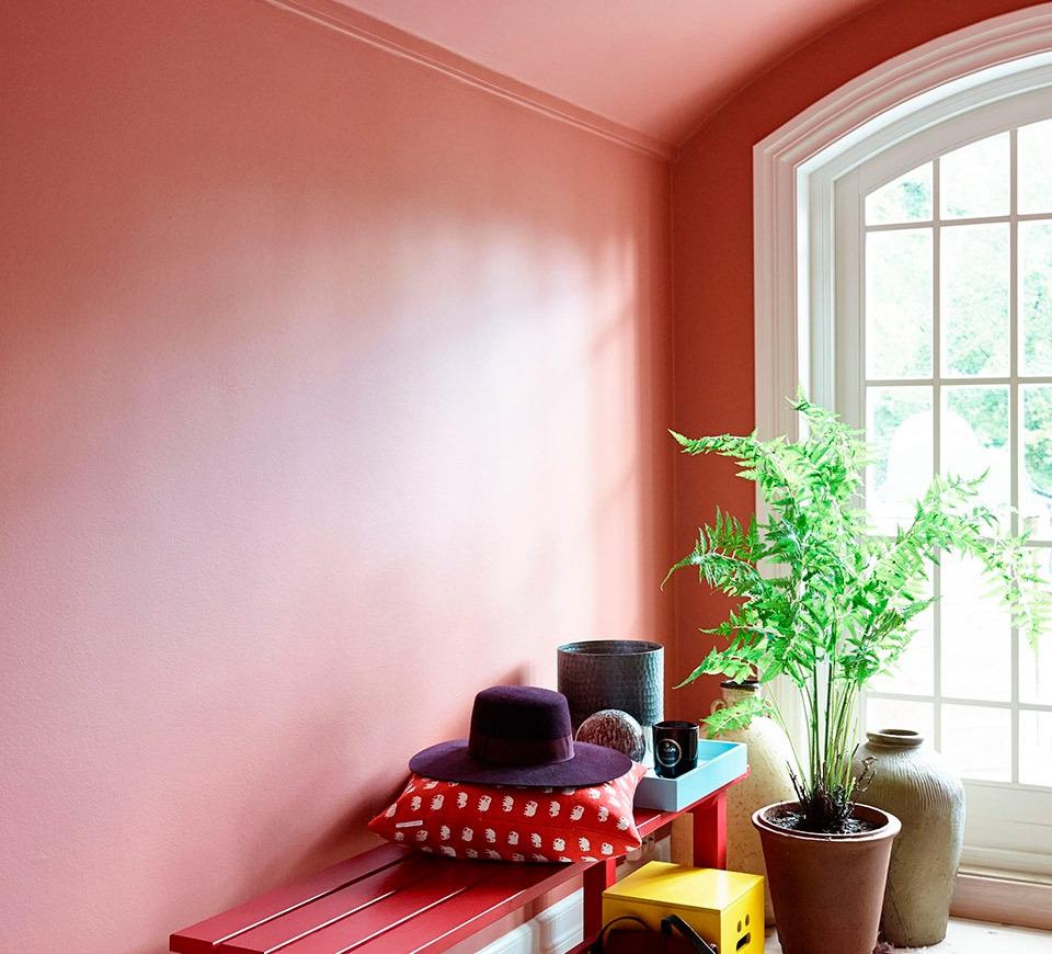 «Hvorfor ikke male himlingen? Det gir en flott effekt. Ved å bruke samme farge som veggen, men i en lysere kulør, oppnår du en fin helhet. På denne måten kan du unngå det «hvite lokket» som hvite himlinger ofte gir en følelse av, spesielt hvis du velger sterke eller mørke farger på veggene.»