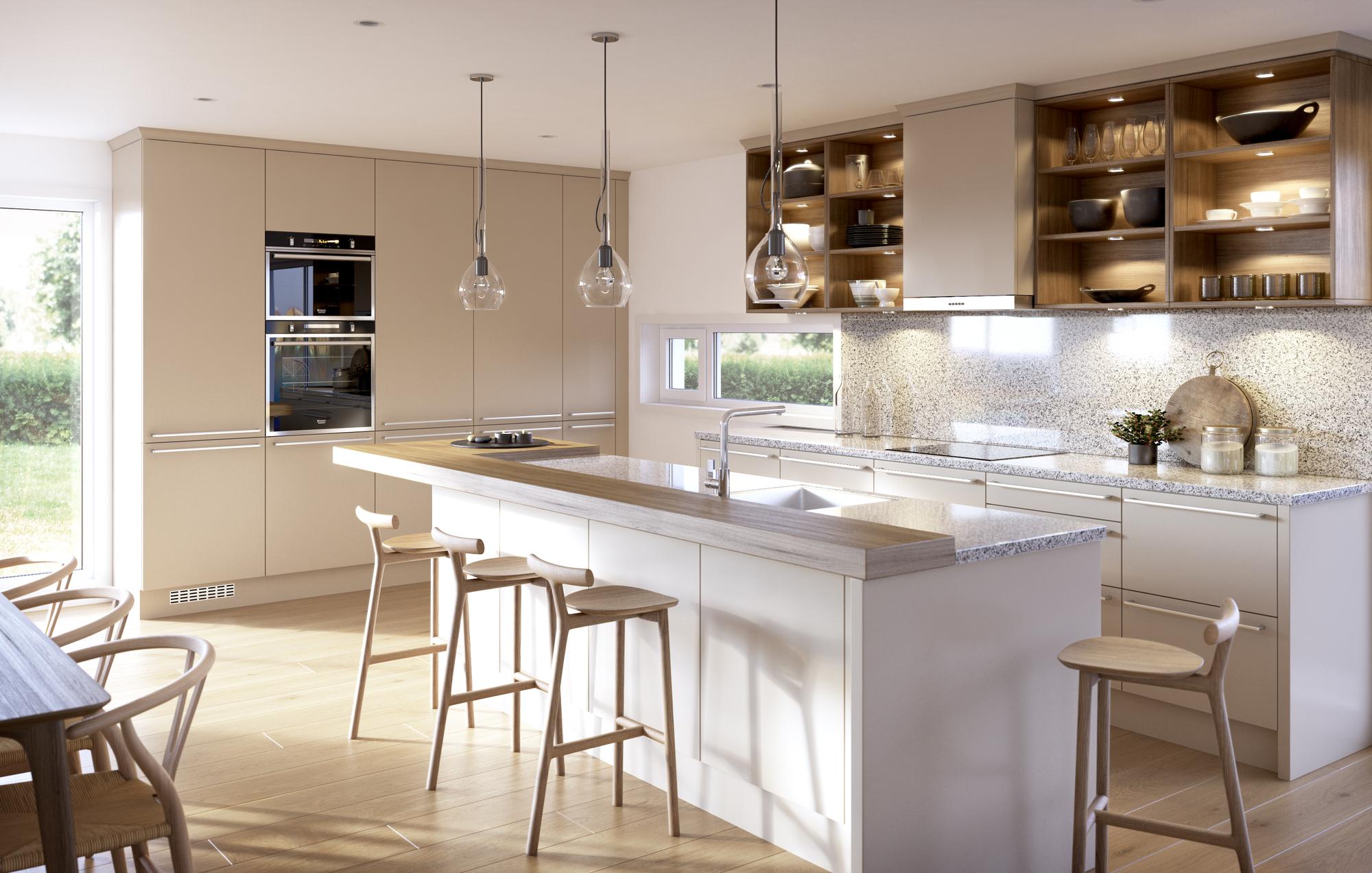 Lyse og nøytrale toner på kjøkkenet i eneboligen Stord.