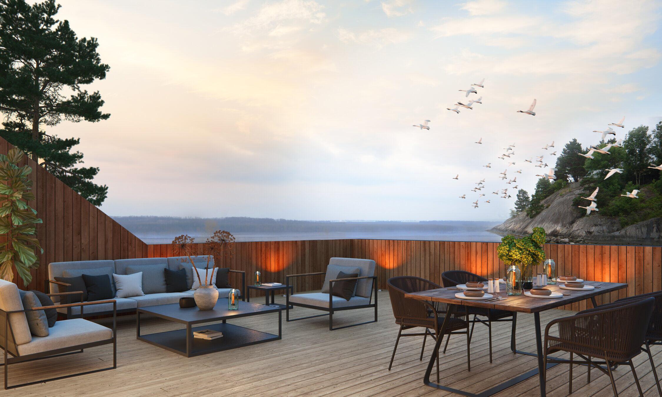 Et funkishus med takterrasse gir en fin forlengelse av oppholdsrommet innendørs. Sjekk ut vårt nyeste funkisdesign i husmodellen Etne!