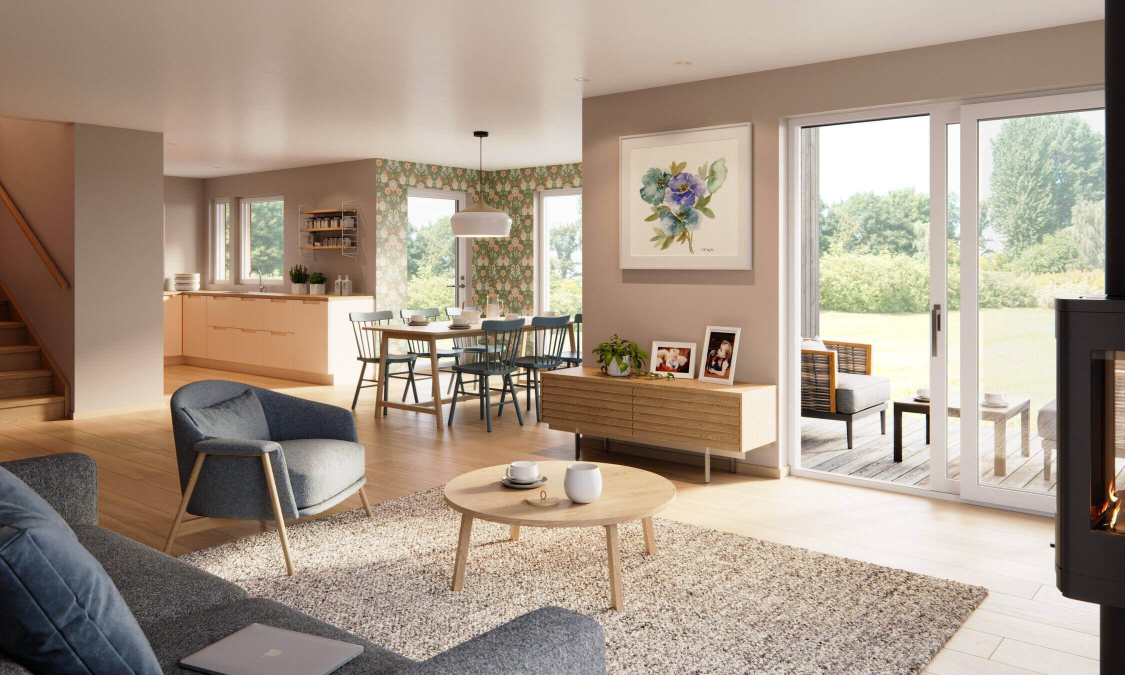 Boligen tilbyr en funksjonell og fleksibel planløsning som passer godt for familier og underholdning av gjester. Stue og kjøkkenet har en åpen planløsning, noe som gir mulighet til å samhandle med familie og gjester.