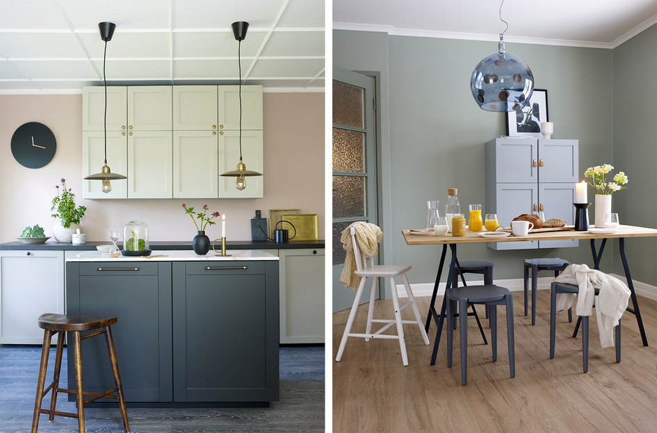 - Et kjøkken i én stil kan noen ganger fremstå som litt «massivt». Ved å kombinere litt ulike materialer kan du ofte skape et mer harmonisk uttrykk. Gå for eksempel for en kjøkkenøy i en litt annen farge, som likevel går i samme fargetone som veggen. Det skaper dybde og tilhørighet. Her kan Solgangsbris FR2270 være et godt alternativ.
