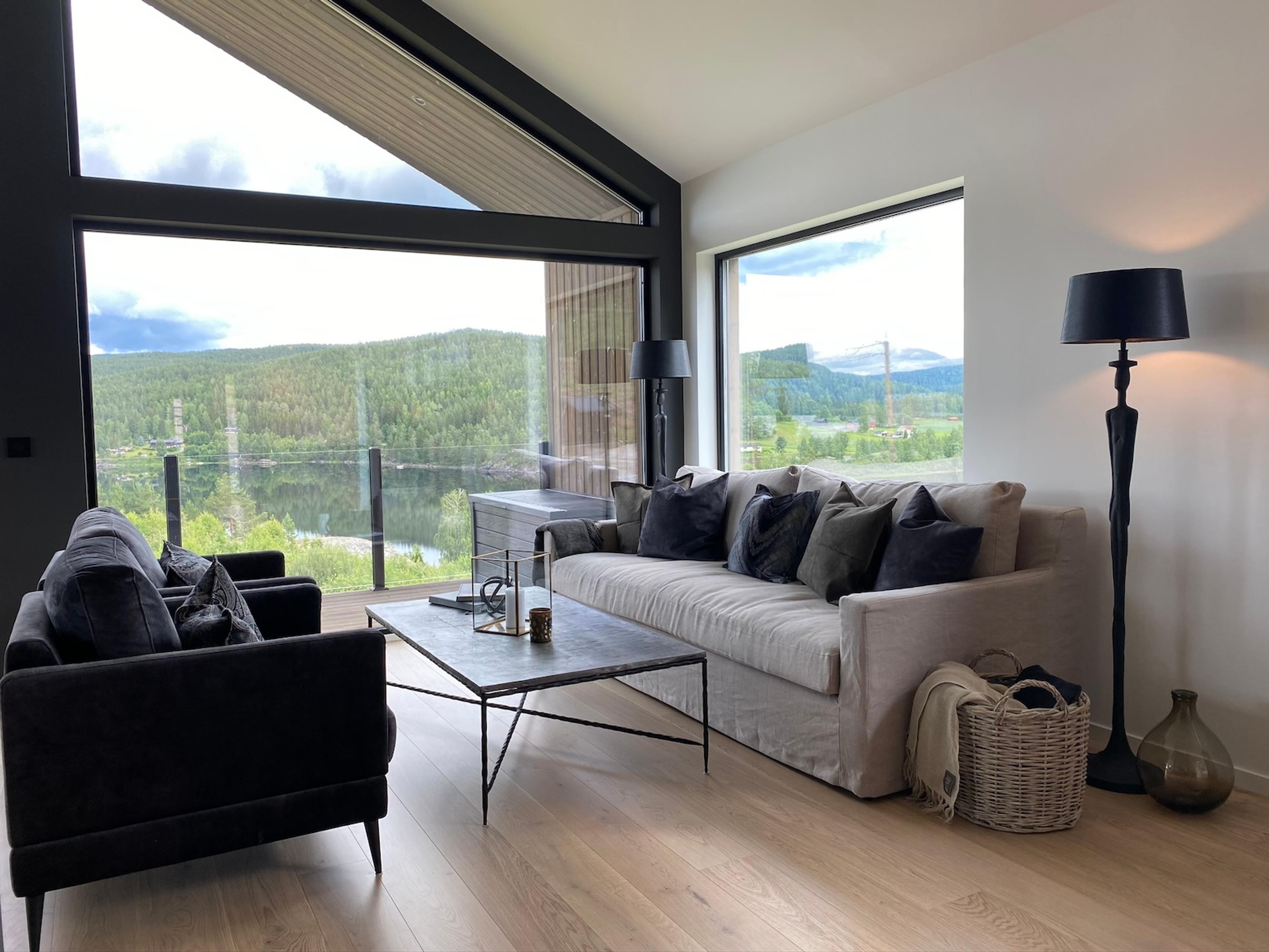 Store vinduer står på ønskelista til mange. Det er ikke feil når du får denne nærheten til naturen. Her fra en kundetilpasset bolig som Blink Hus Sigdal har bygget i Sigdal.