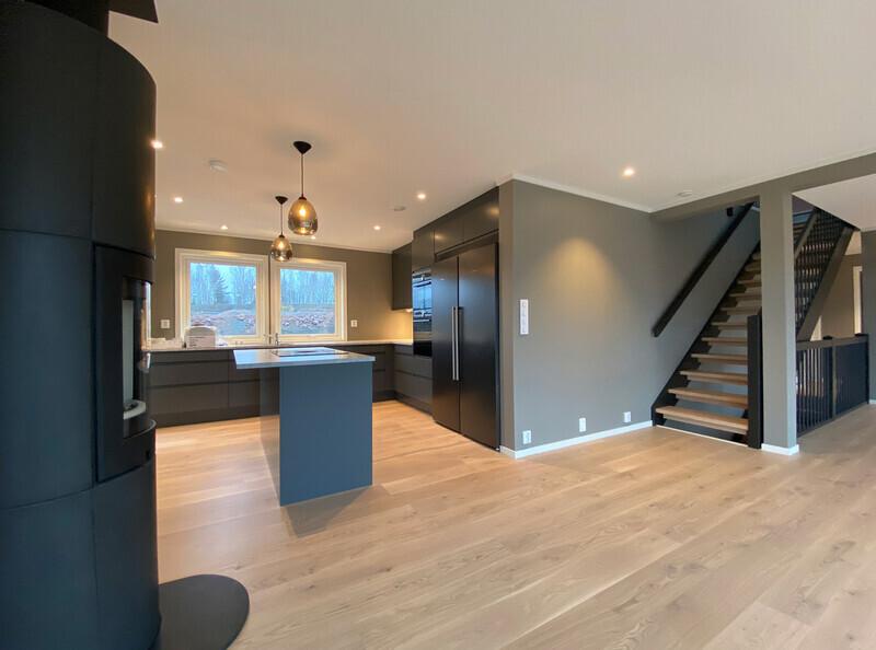 I Trude og Eirik Veum sitt kjøkken er det god plass! Legg merke til at kjøkken, peisovn og trappevanger/rekkverk er i sort farge og passer svært godt sammen. Fargene på både vegg og innredning binder rommene sammen og skaper en fin helhet.