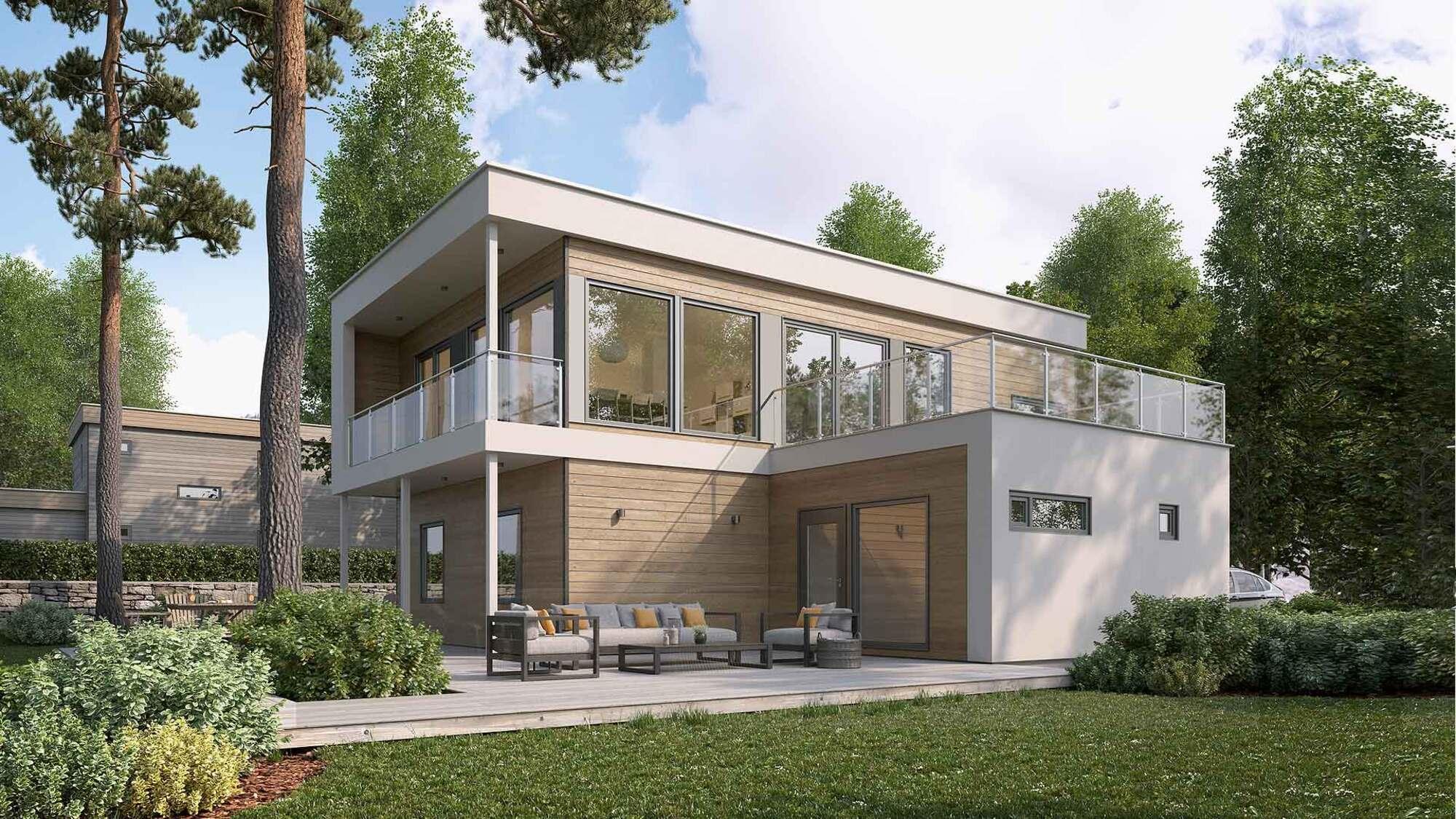 «Jeg ville nok begynt å se på funkis og moderne, og prøvd å finne et hus som forener disse. Jeg liker de rette rene linjene i funkishusene, men samtidig ønsker jeg et mykere uttrykk uten for mye betong. Ved å ha et hus med mange rette linjer og store vinduer, men mye treverk i fasaden får man et uttrykk jeg ville likt.»