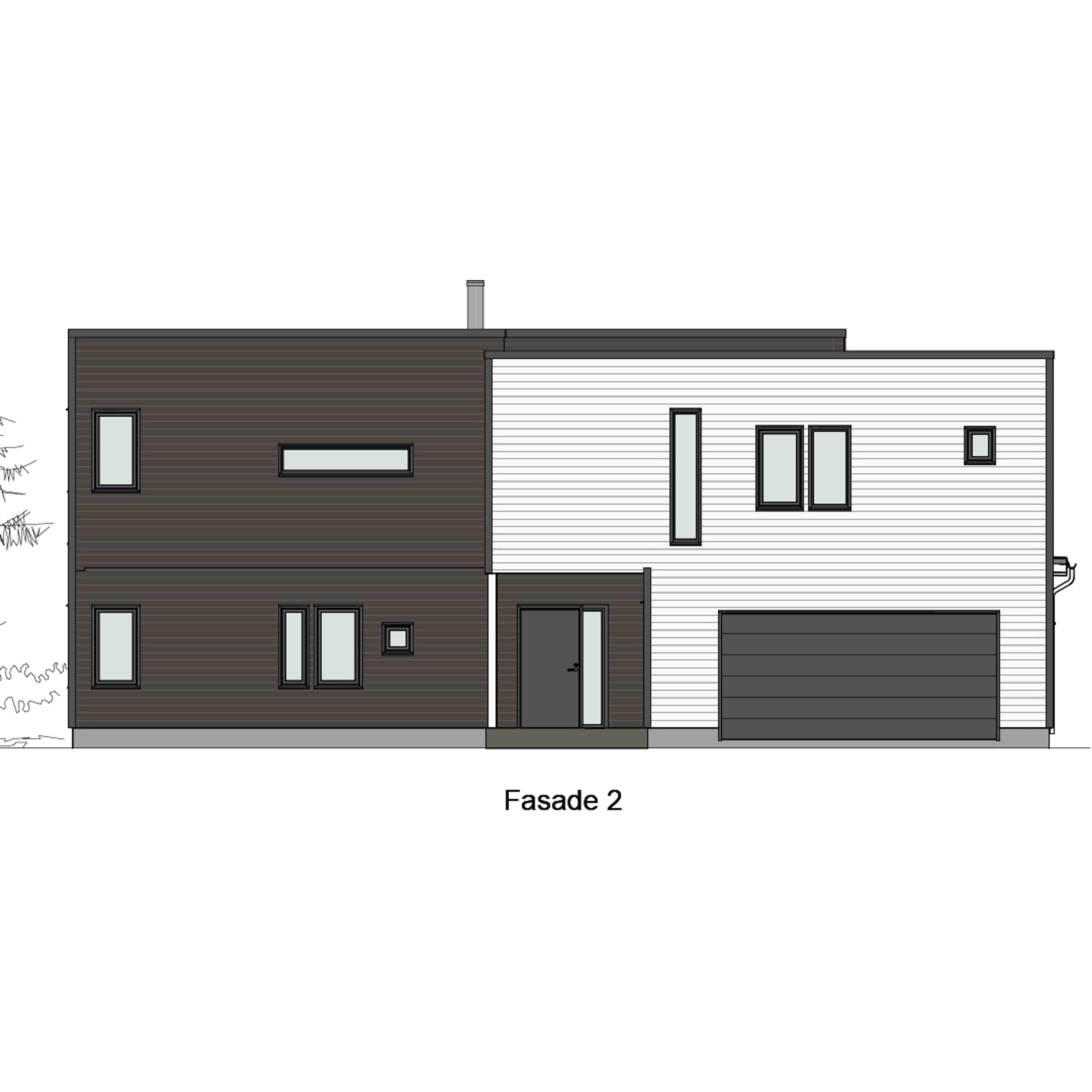 Haugesund er et stort og moderne hus med spennende og funksjonelle løsninger. Delen av huset med integrert garasje kles gjerne med alternativ kledning, for å understreke husets to bygningskomponenter.
