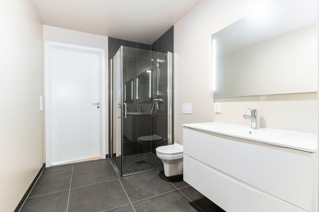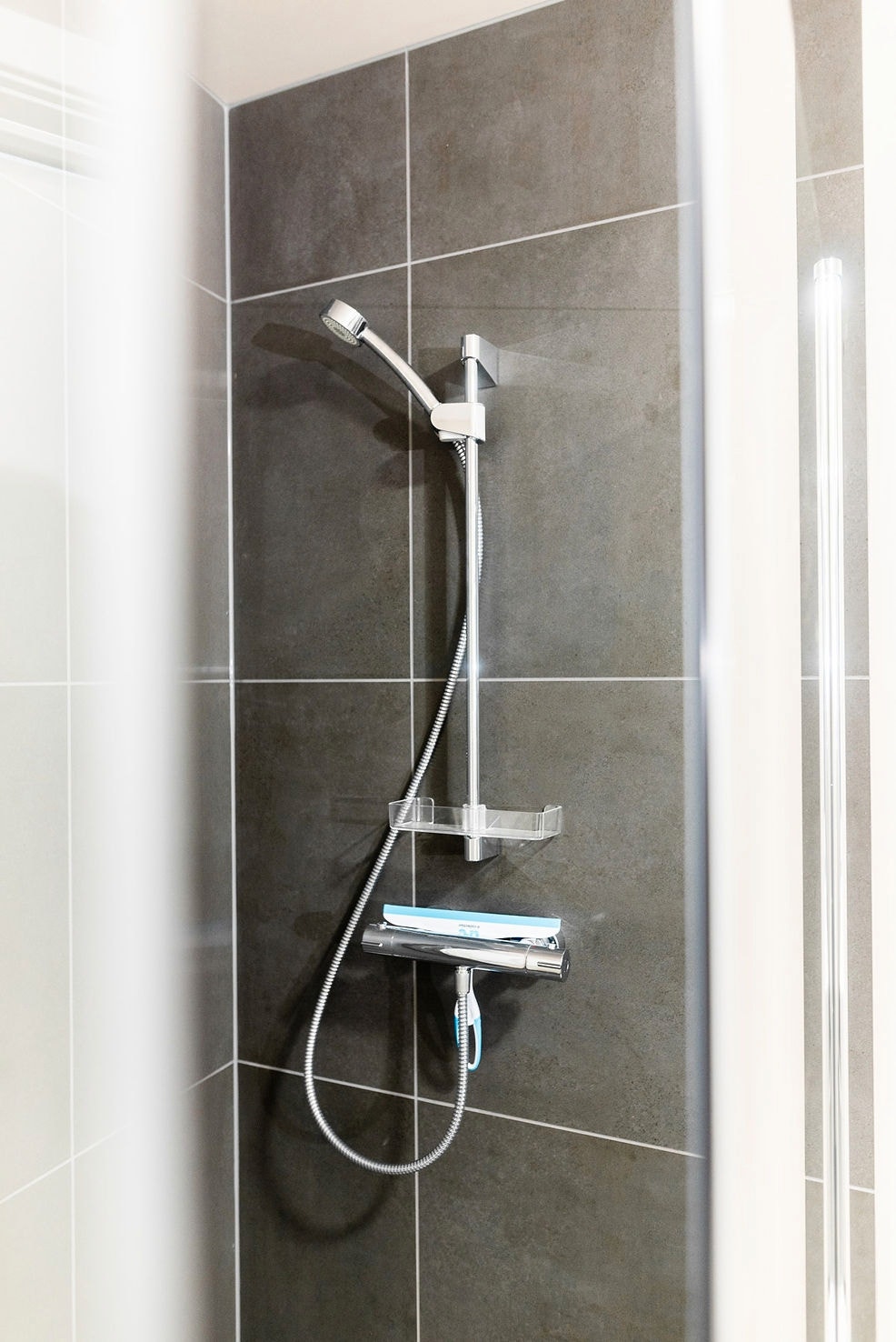 - Badet har fliser på gulv og fliser på vegg i dusjsonen.