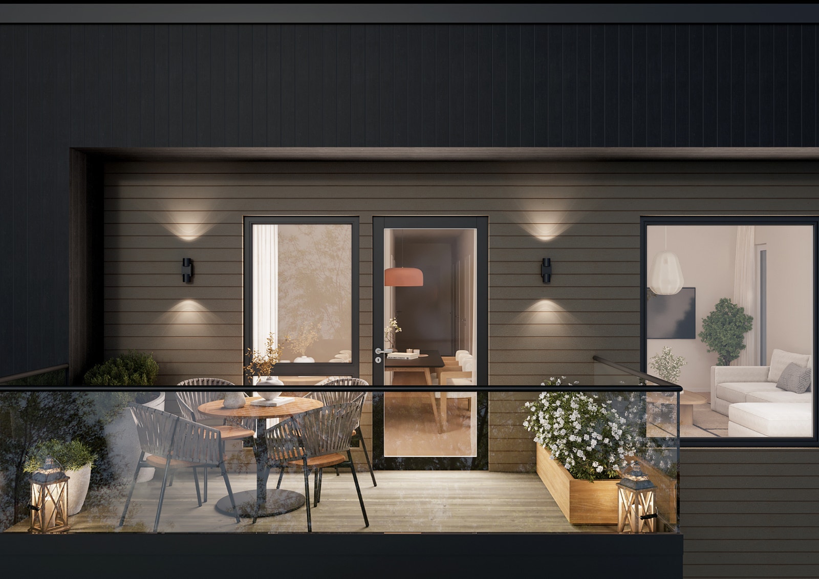 Både terrassar og inngangsparti er overbygde, og bustadane har eit moderne og stilreint utvendig uttrykk.