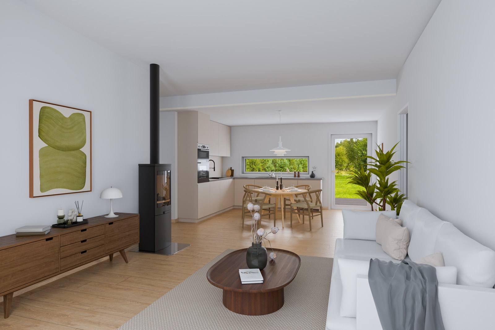 Stuen og kjøkkenet danner et åpent og sosialt samlingspunkt, med utgang til egen terrasse og en lettstelt hage – perfekt for både rolige stunder og hyggelige sammenkomster.