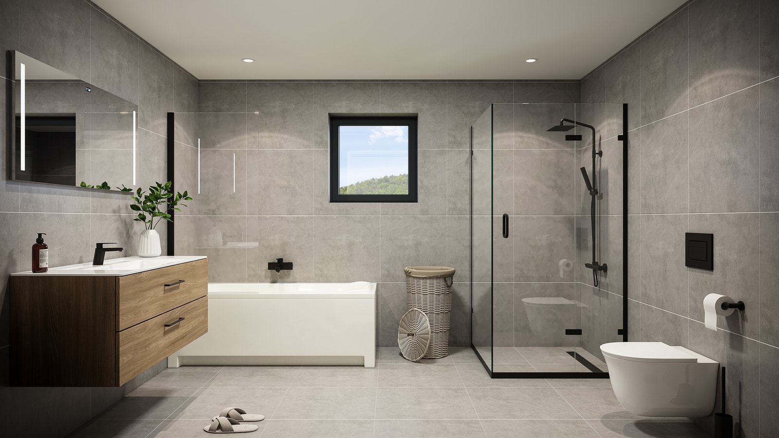 Standard bindingsverk i varierende dimensjoner tilpasset bærekonstruksjoner og rørføringer. Gipsplater som innvendig platekledning. Platene behandles med sparkel, grunning og 2 strøk silkematt maling (valgfri NCS-farge).