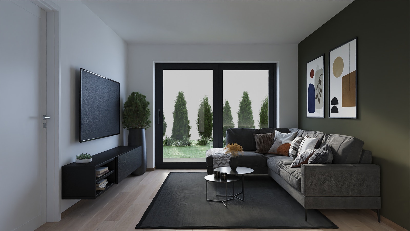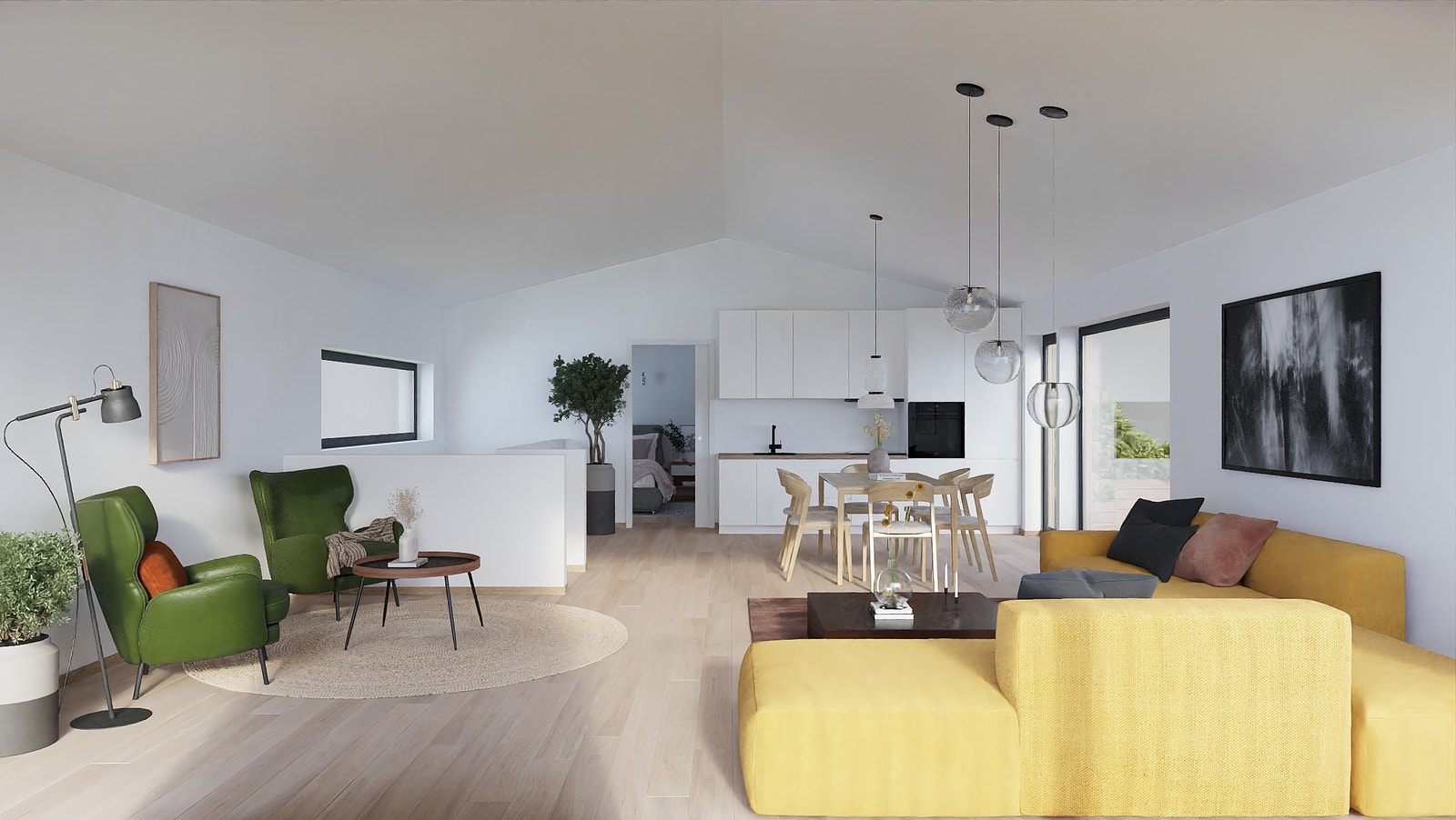 Gulv i oppholdsrom leveres med 1-stav hvitpigmentert eikeparkett. Det leveres med 60x60cm standard gulvflis i vindfang og begge bad med varmekabler.