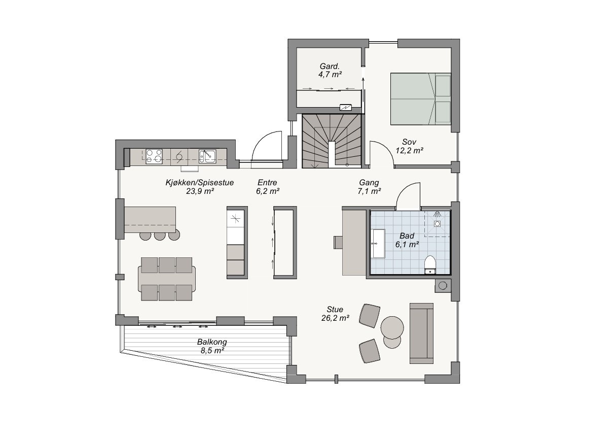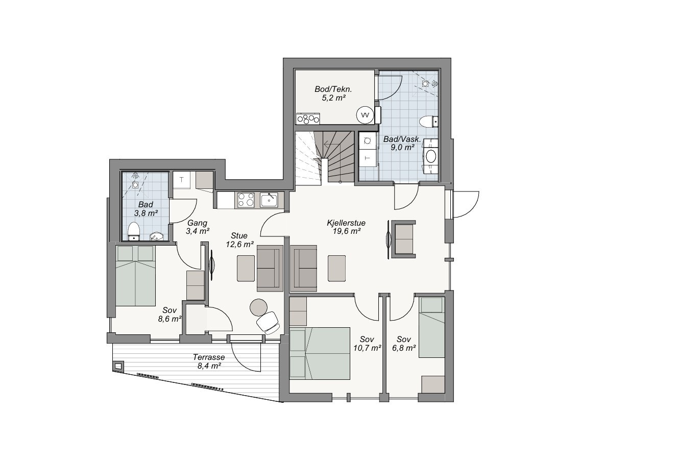 Askøy er utviklet som et dynamisk hjem der åpne passasjer og strategisk plassering av rom skaper en naturlig flyt av lys og god kommunikasjon mellom sonene. Huset er designet for å være både fleksibelt og tilpasningsdyktig, slik at det enkelt kan justeres etter beboernes skiftende behov over tid.