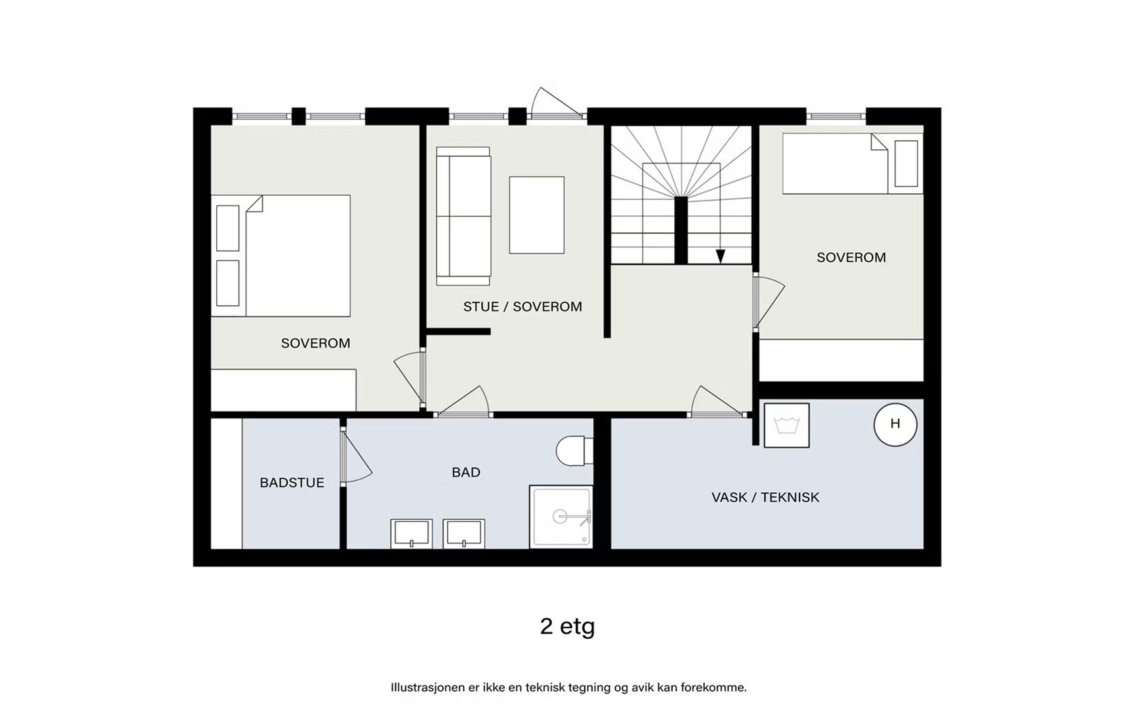 U. etasje: Gang, stue/soverom, bad, badstue, 2 soverom og vaskerom/teknisk rom.