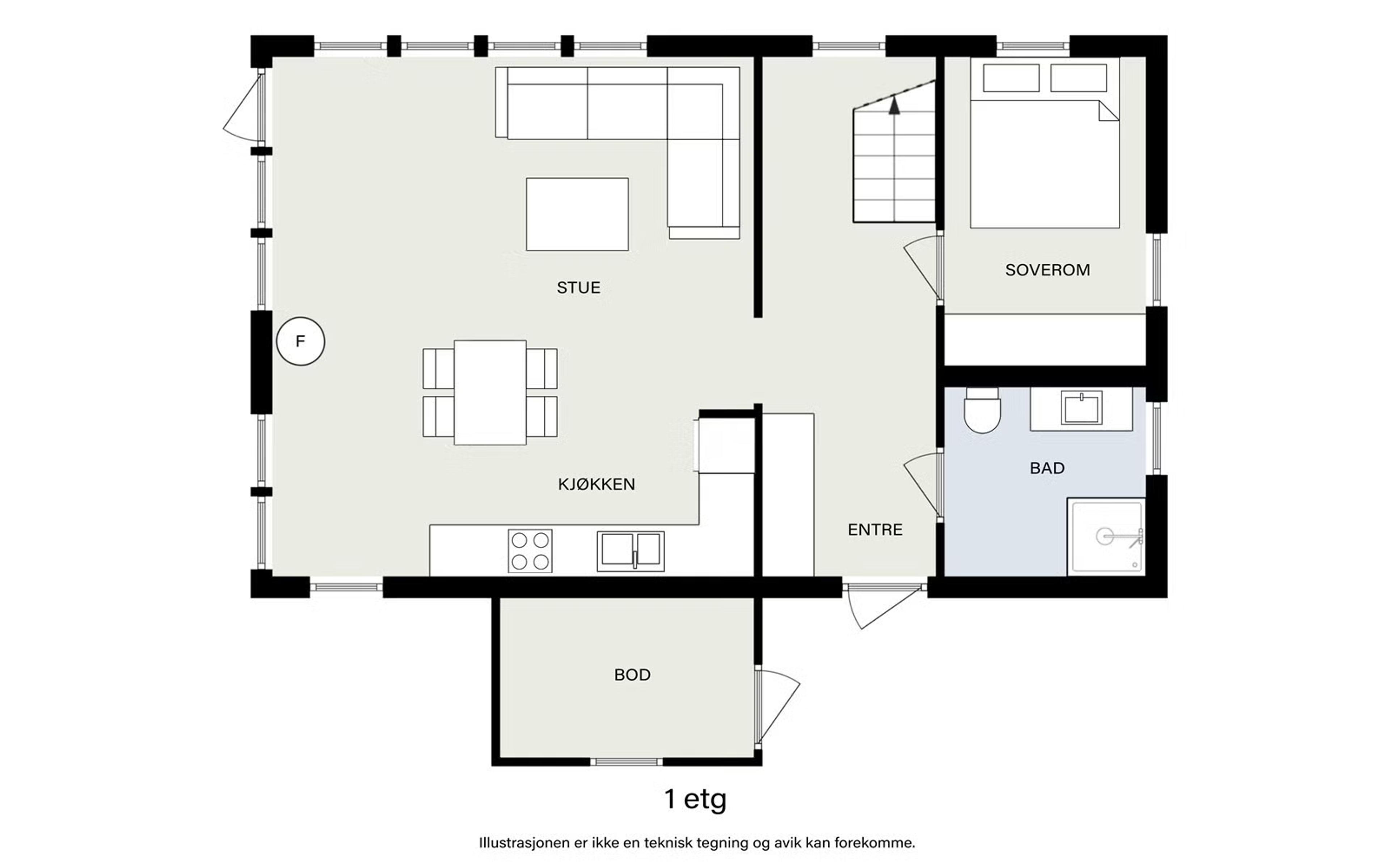 1. etasje Entré, stue/kjøkken, soverom, bad og en utvendig bod.