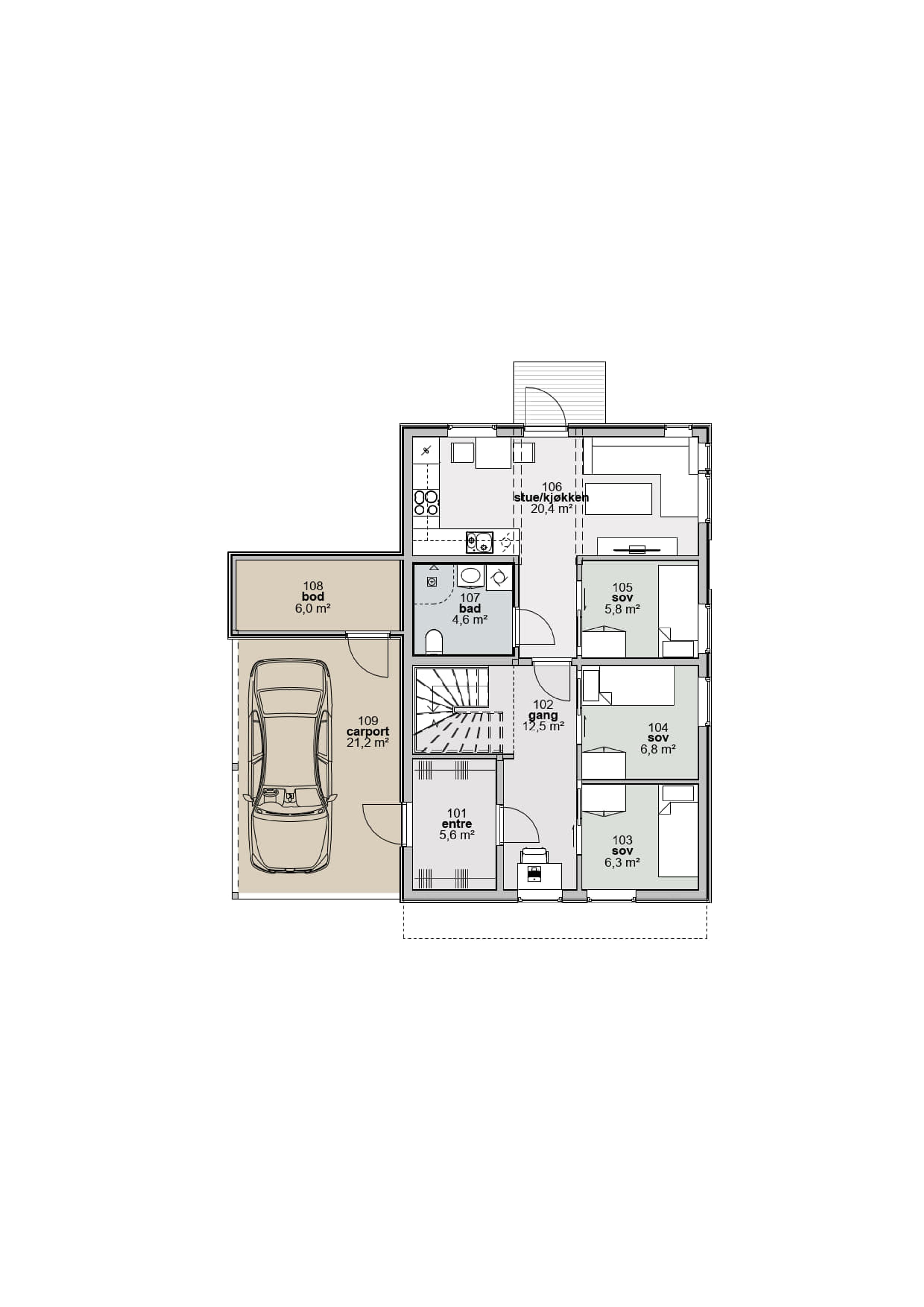 Denne stilrene eneboligen med hybel kombinerer funksjonalitet og komfort på beste vis. Her går du rett fra carporten inn i boligen, og videre ut på en romslig terrasse over carporten.