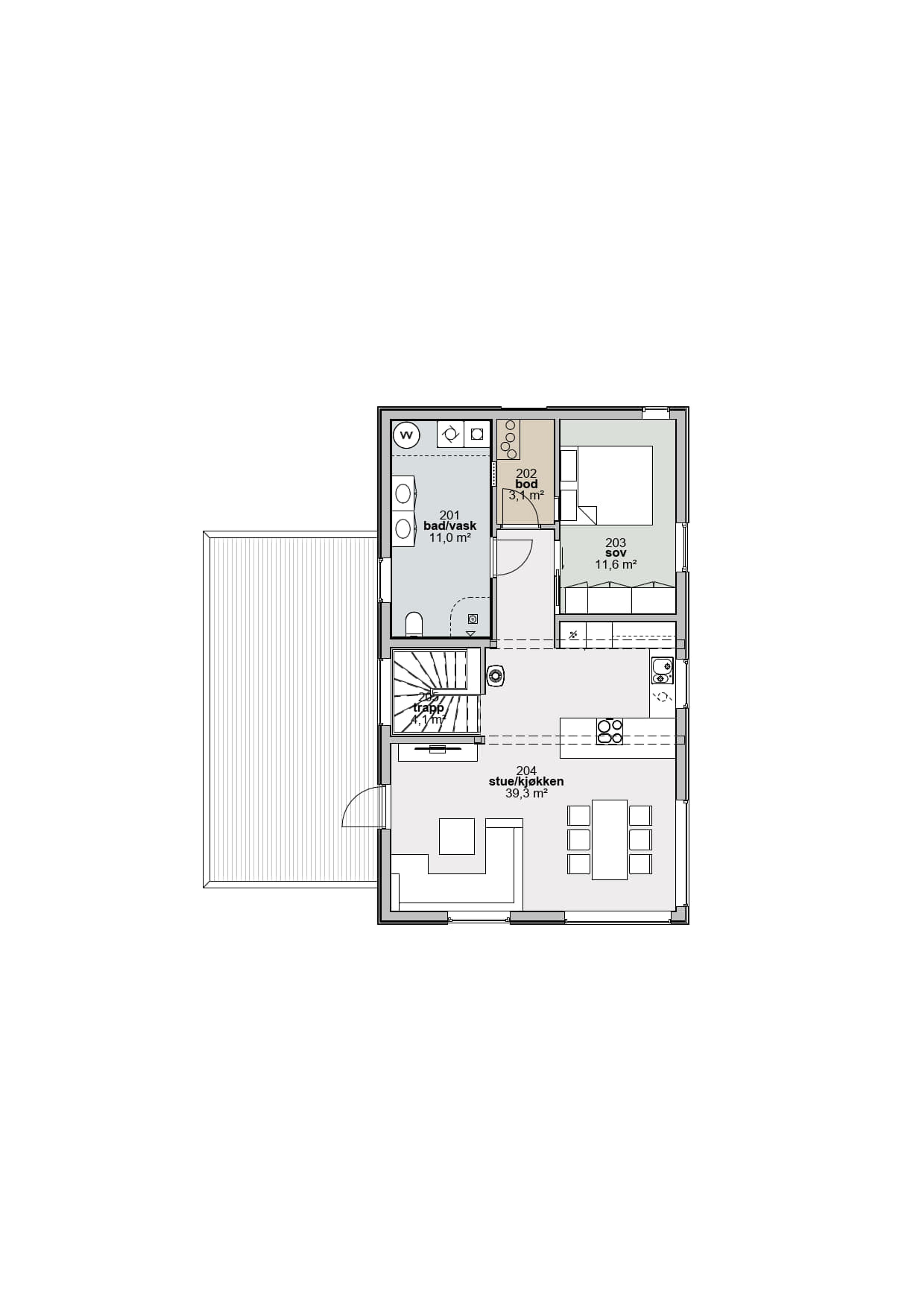 - 2.etasje hoveddel: Stue/kjøkken, bad/vaskerom, soverom, bod og takterrasse