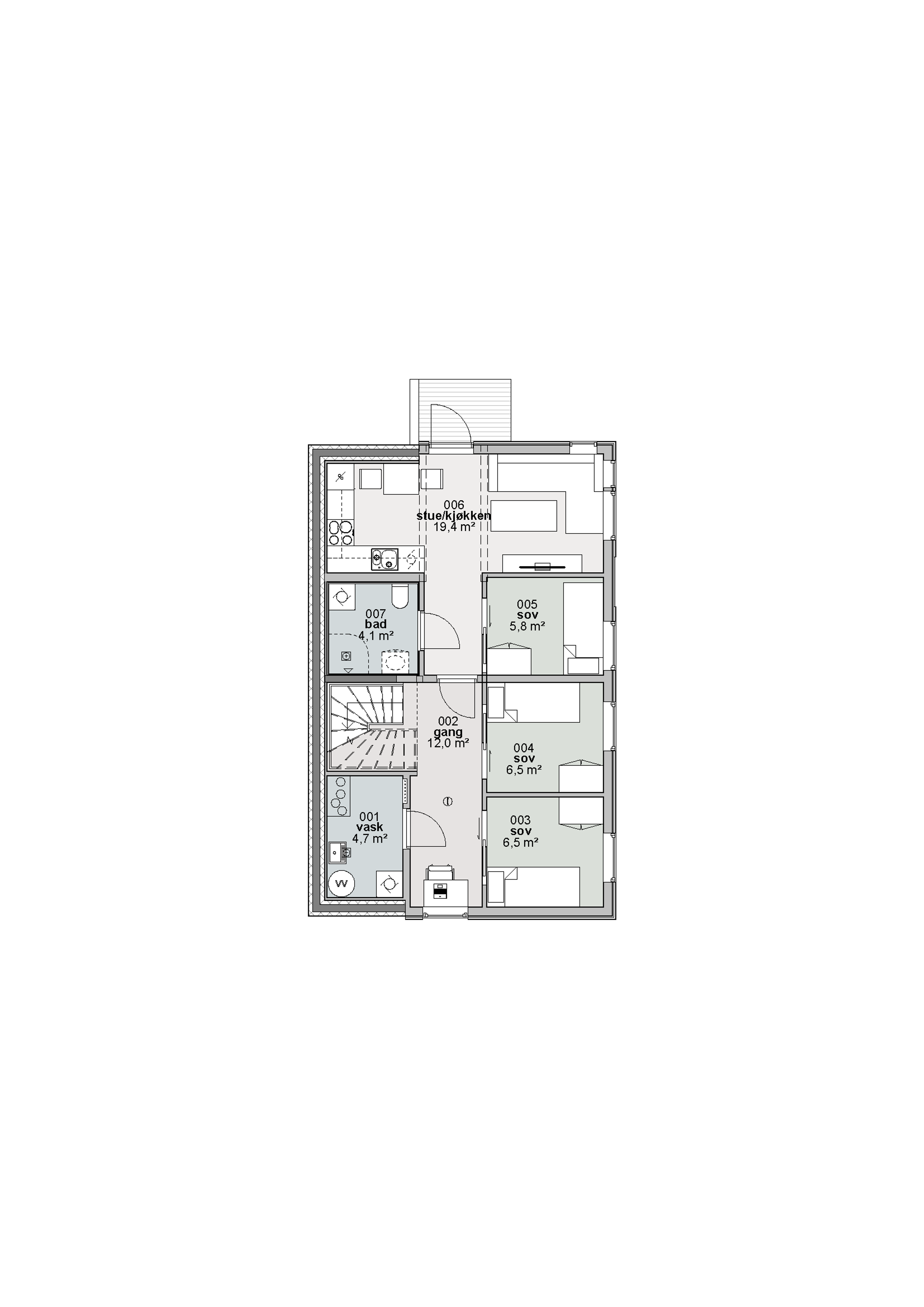 - Underetasje hoveddel: Gang, to soverom, vaskerom
