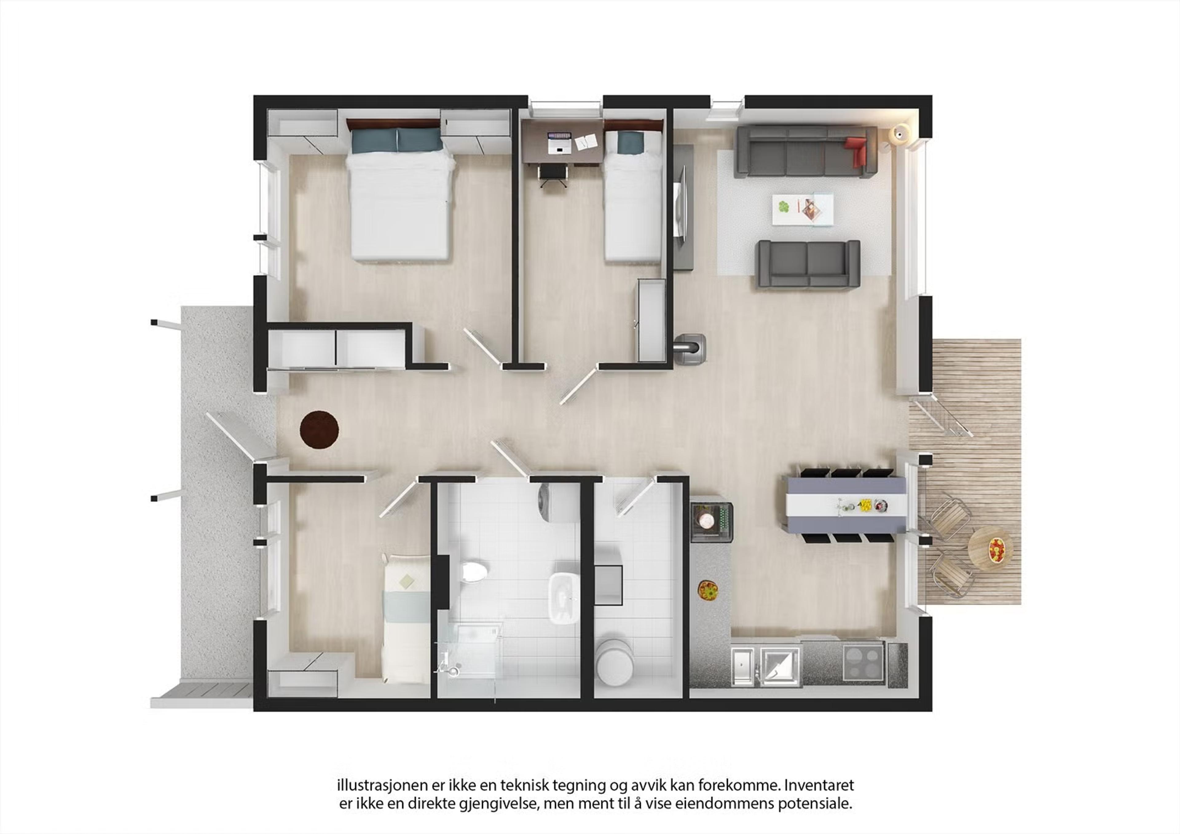 Boligen har et lyst og tidsriktig interiør med praktisk planløsning over ett plan. Den inneholder entré, gang, tre soverom, bad, bod samt åpen stue-/kjøkkenløsning med utgang til terrasse og hage.